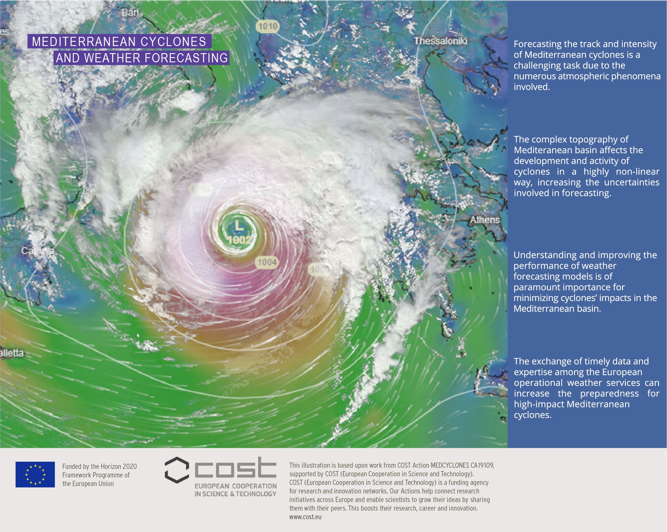 Coordinated research will be largely based on the analysis of a large number of cyclone case studies, that will be identified in collaboration, involving researchers and forecasters from both the eastern and western Mediterranean, giving priority to cases where forecasts failed to reproduce the cyclone properties (e.g. intensity, track or morphology) and/or the associated extreme weather phenomena (e.g. heavy rainfall, wind storms and dust transport).