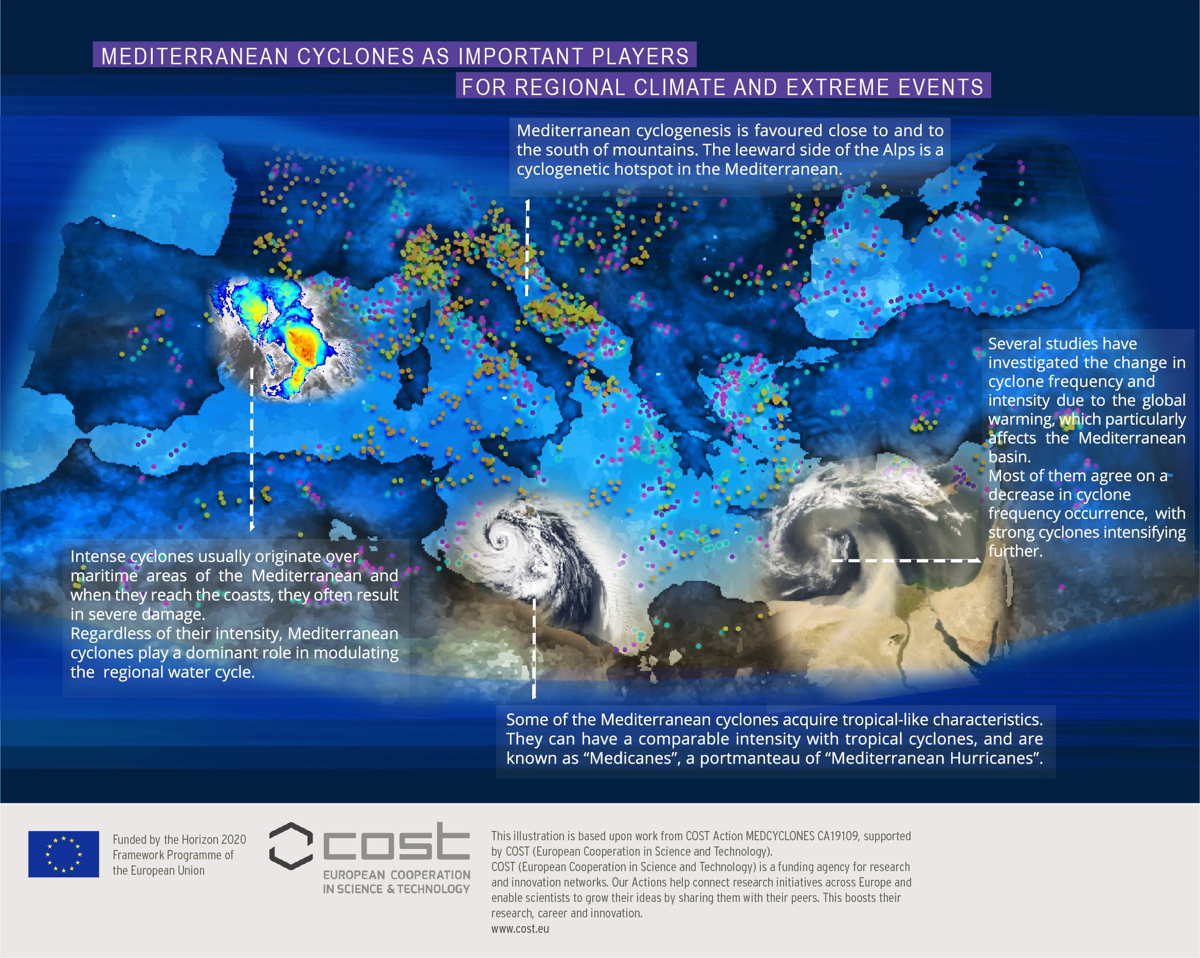 Research activities will be performed in the framework of climate prediction (past, present and future), taking also advantage of the new ERA5 reanalyses and CMIP6. By sharing and applying a variety of diagnostic tools (e.g. cyclone tracking tools, cyclone phase diagrams and decomposition of surface pressure tendency) the main aim is to identify different categories of Mediterranean cyclones with regard to their relevant thermo-dynamical processes, and to establish a widely accepted definition of the criteria that qualify some Mediterranean cyclones as tropical-like systems (known as medicanes). Results will be used to assess the ability of climatological datasets (e.g. MED-CORDEX simulations) to reproduce cyclone categories and their climatology, as well as to better understand the evolution of Mediterranean cyclone categories and their related processes in a changing climate. In synergy with WG1, results will be exploited to improve cyclones representation in weather forecasting and climate models.